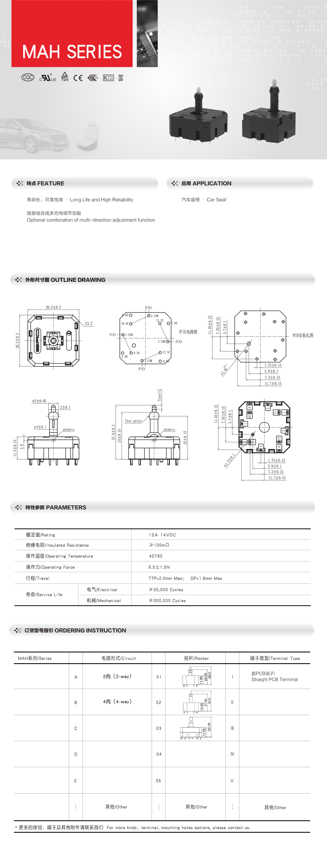 MAH系列 汽车座椅调节开关 KSD摇杆4向电动座椅调整开关