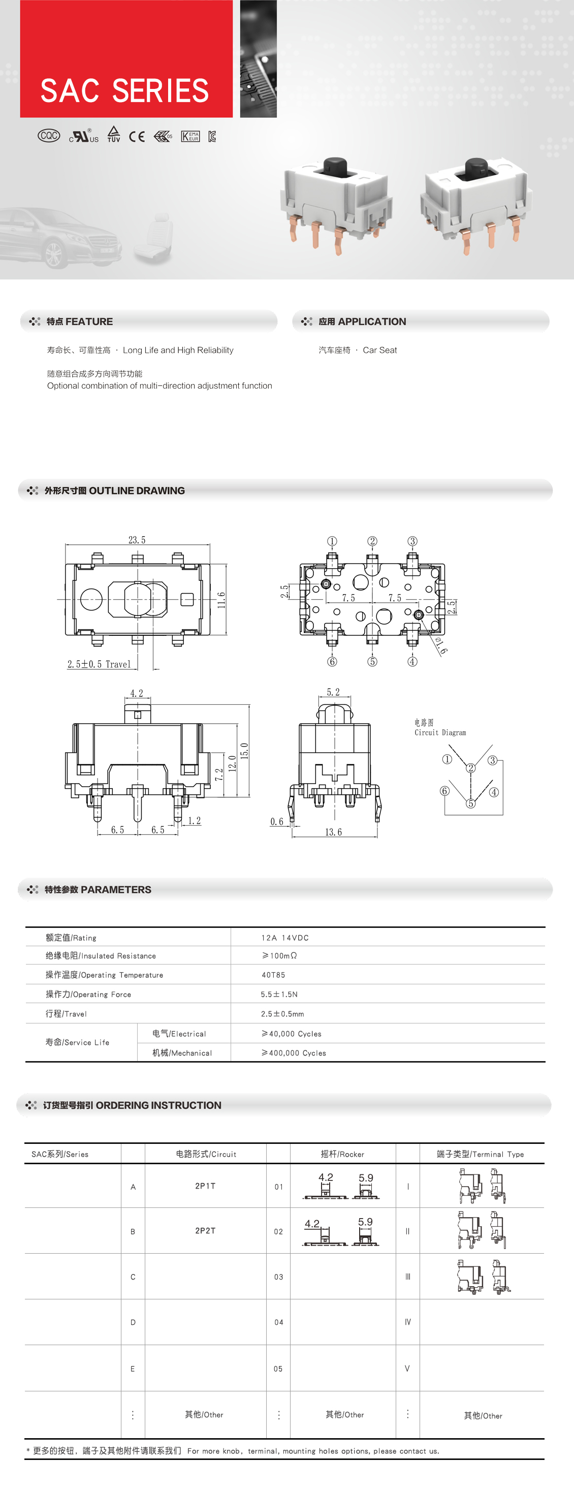 SAC系列 汽车天窗复位开关 汽车座椅靠椅控制调动开关