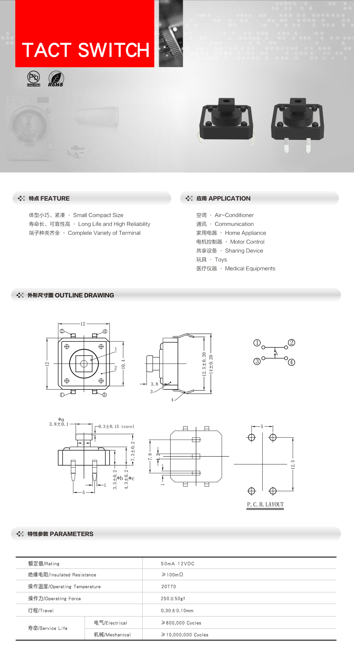 12*12系列 12mm轻触开关 PCB插脚式微型按键开关