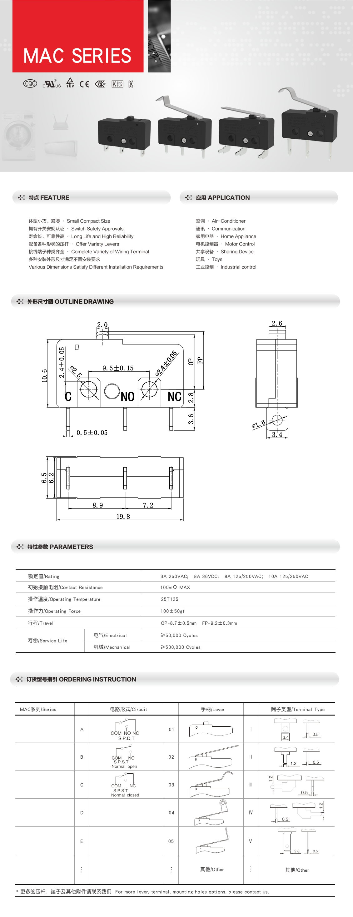 MAC系列 微动开关 短焊线端子脚 多规格压杆