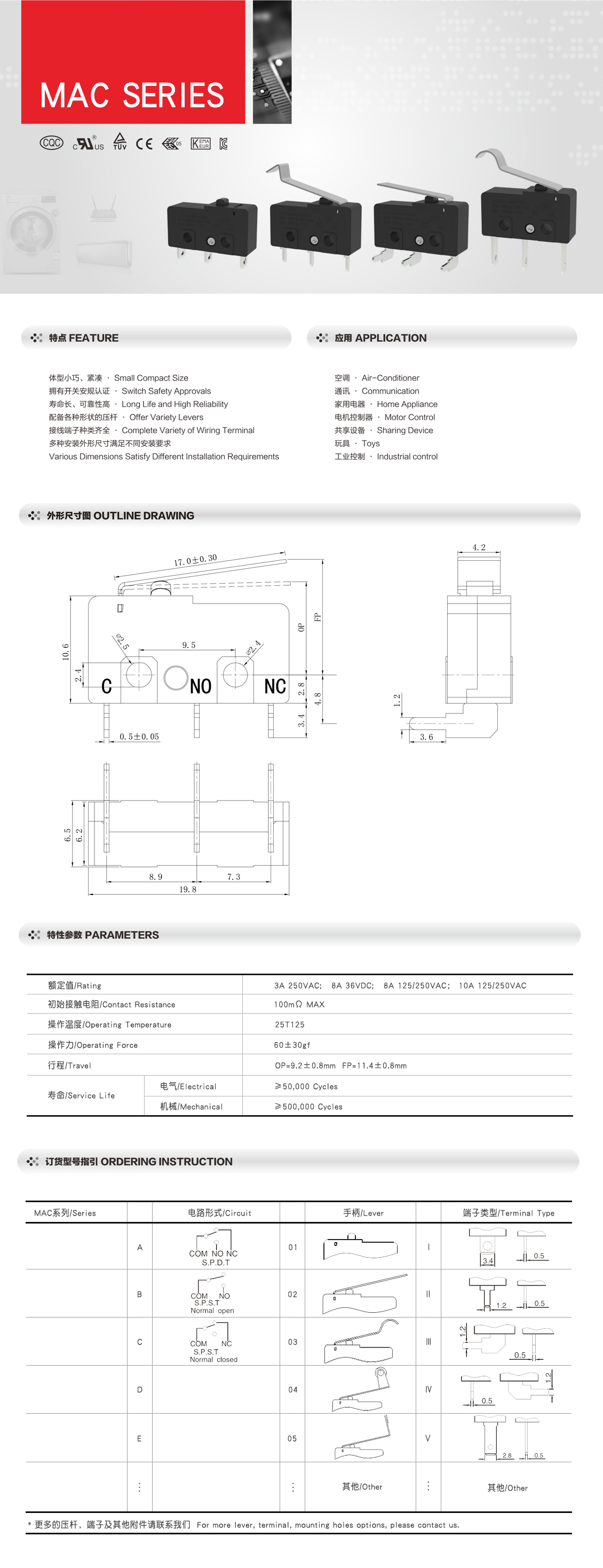 MAC系列 微动开关 侧PCB端子脚 多规格压杆