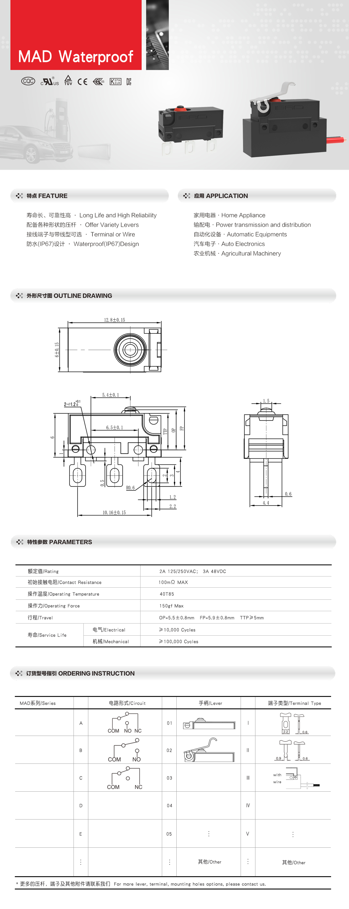 MAD系列 防水微动开关 Ⅰ型外壳 可焊线包塑