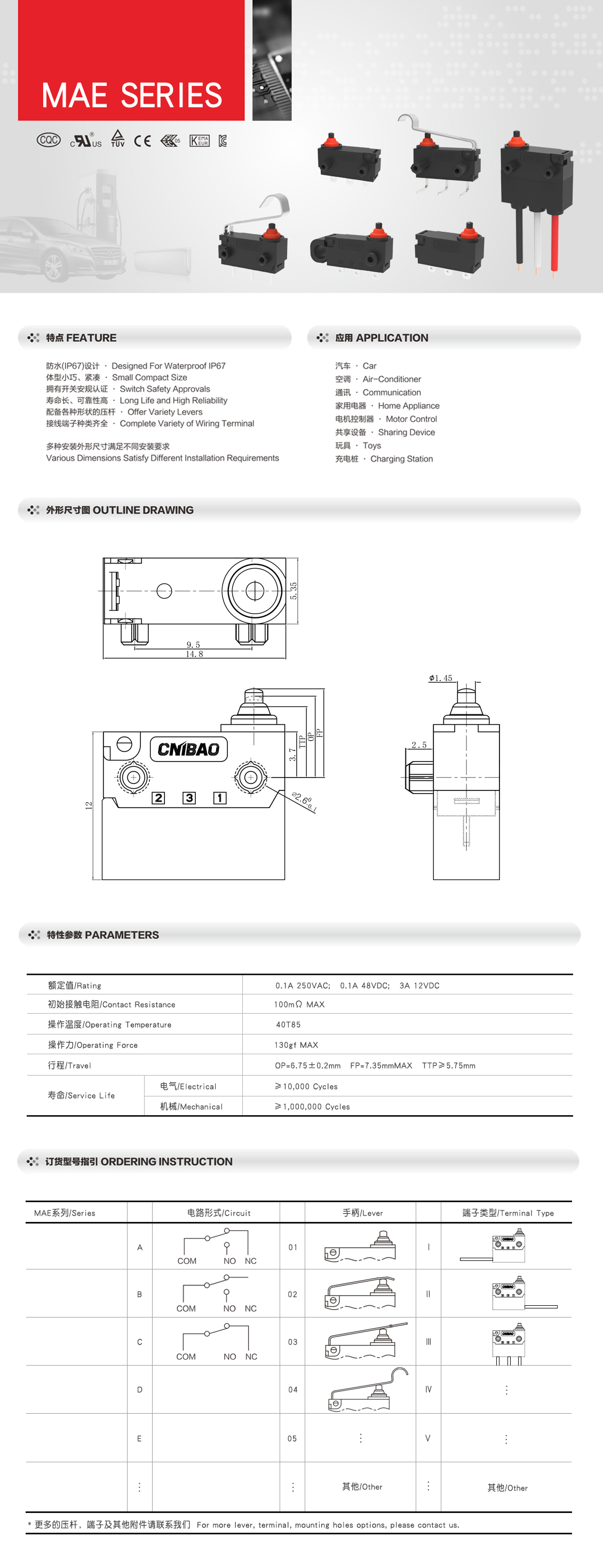 MAE系列 防水微动开关 Ⅲ型外壳 焊线包塑款