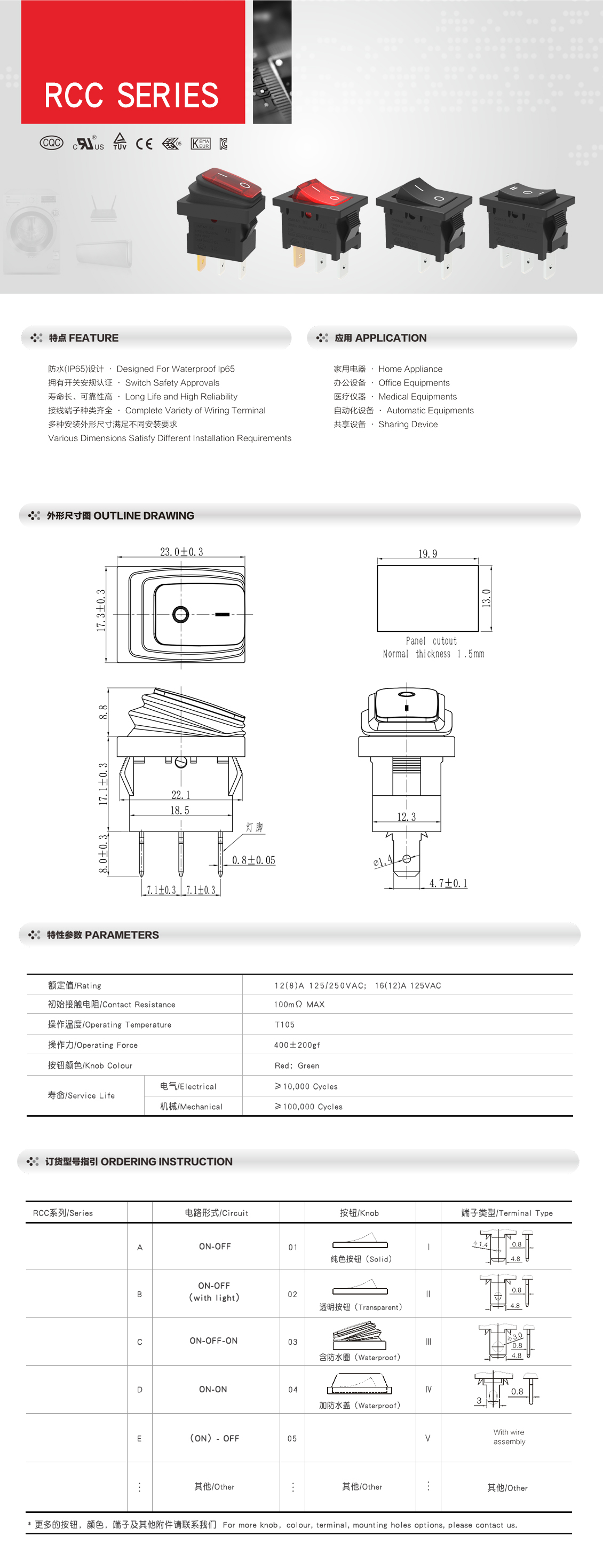 RCC系列 防水IP65船型开关 方形翘板开关KCD1 带灯ON-OFF